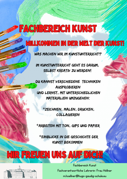 Das Fach Kunst leistet einen besonderen Beitrag im Schulalltag der Hugo-Gaudig-Schule. Im Zentrum des Faches Kunst steht die praktische Auseinandersetzung mit künstlerischen Sicht- und Arbeitsweisen. Inhaltlich tragen die Bereiche der Malerei, Grafik, Plastik und Fotografie uvm. zu einem abwechslungsreichen Unterricht bei.