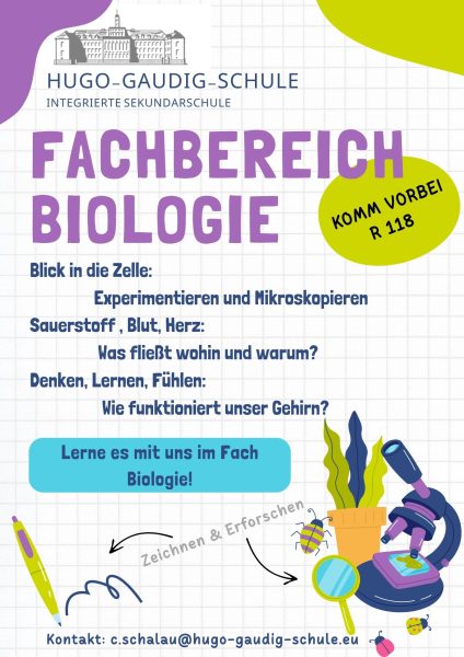 Hier lernst du im Laufe deiner vier Jahre alles, was wichtig ist. Wir beginnen mit der Zelle, schauen uns unsere Ernährung an und lernen, wie Pflanzen und Tiere bei uns zusammenleben.